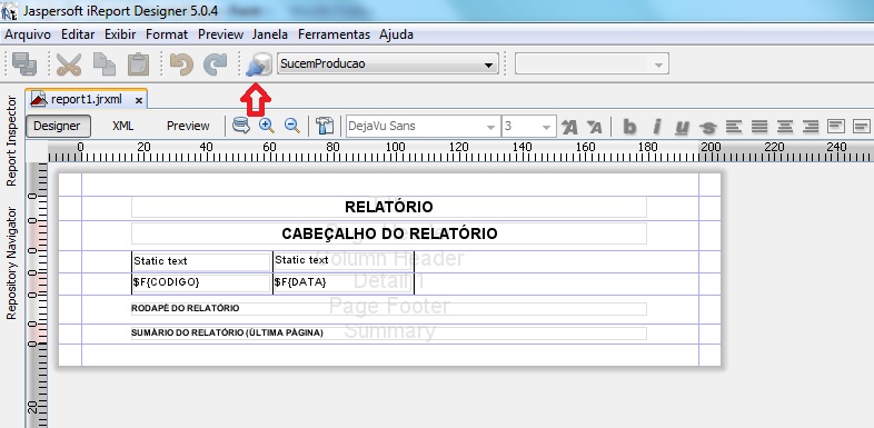 Caso o "Report Inspector" não esteja visível, torne-o visível no menu "Janela/Report Inspector".
