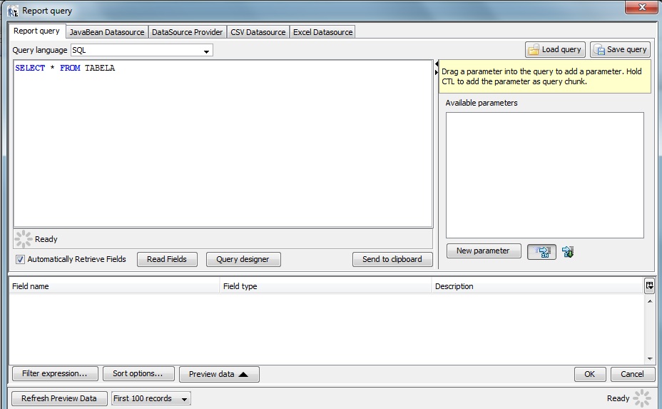 Observação: para que os campos de sua consulta apareçam aqui, é necessário colocar toda a consulta na janela de edição (SELECT * FROM CIDADES WHERE COD_PAIS = 001 AND COD_ESTADO = 005, por exemplo). Depois de inseridos todos os campos necessários, deve-se recolocar a consulta original: