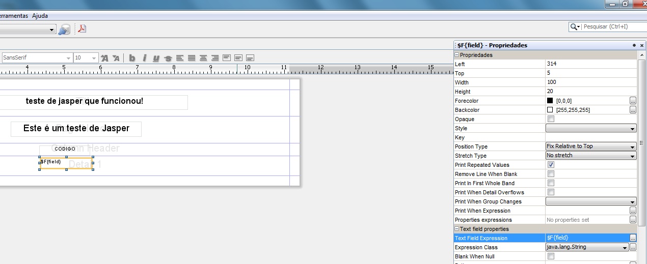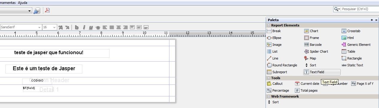Depois disso, você poderá inserir no relatório, campos que correspondam aos campos da sua consulta. Vá no menu "Janela/Paleta" (se já não estiver visível), selecione e arraste o "Text Field" para a área do relatório. Geralmente, esse tipo de campo é colocado na parte "Detail", para que ele se repita quantas vezes forem o número de linhas da sua consulta, mas você poderá colocá-lo em qualquer parte, dependendo das suas necessidades.