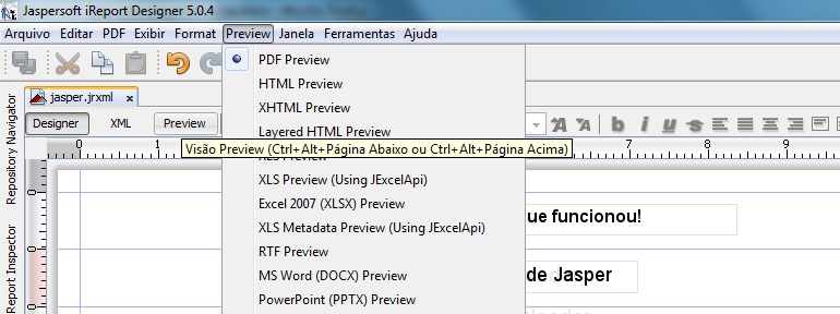 Os recursos oferecidos por esta ferramenta é tema para um livro inteiro, então demonstrarei apenas algo bem básico. Com ela é possível criar todo o relatório de forma visual, configurando o tamanho da página e posicionando os campos onde eles realmente irão aparecer no relatório. Ao final é gerado um arquivo com a extensão jrxml, que poderá ser executado dentro do próprio iReport e gerar a saída em vários formatos, dentre eles o PDF.