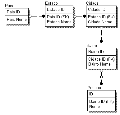 Algumas pessoas iriam preferir colocar na tabela PESSOA os 5 campos: Nome, Pais_ID, Estado_ID, Cidade_ID e Bairro_ID. Outras ainda fariam pior: colocariam além dos IDs, os nomes (strings) para facilitar a referencia.