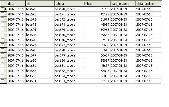 Não vou detalhar o conteúdo de cada tabela, mais preciso também controlar o conteúdo de cada tabela, ou seja o conteúdo de cada disco, pois acompanho o crescimento de cada arquivo dentro de cada disco., aproximadamente 300,000 arquivos dia , distribuídos entre arquivos normais e arquivos de bases de dados.